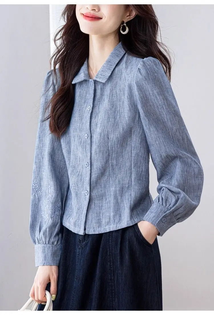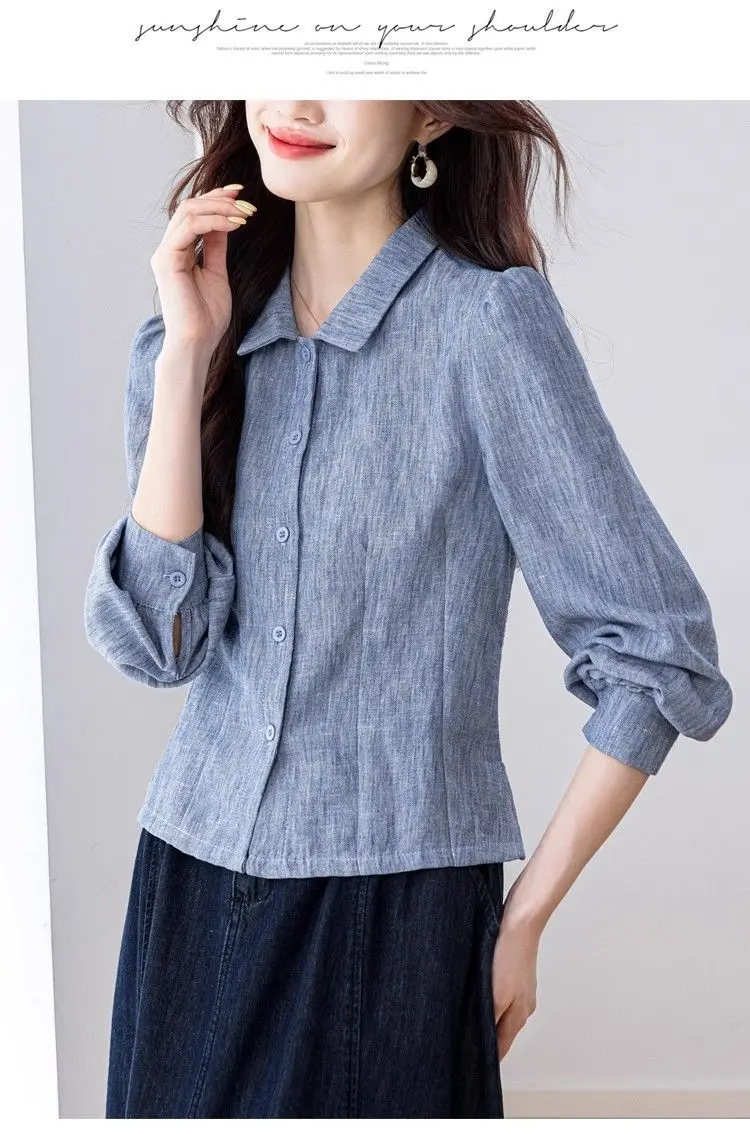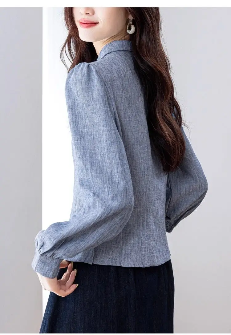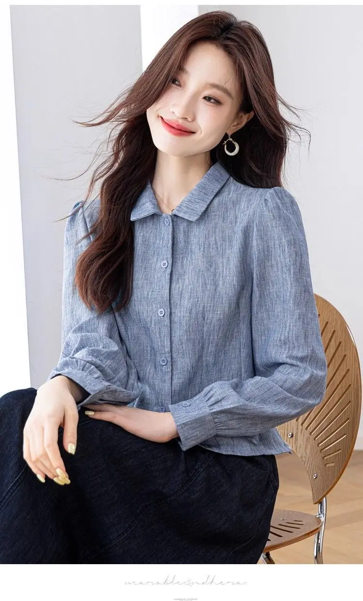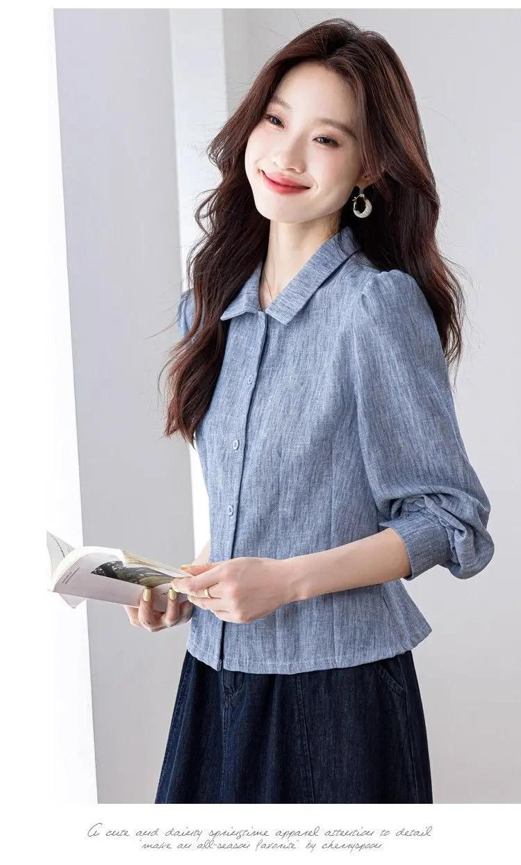 Camisa de cor sólida elegante e elegante feminina versátil botão lanterna manga comprida lapela topo